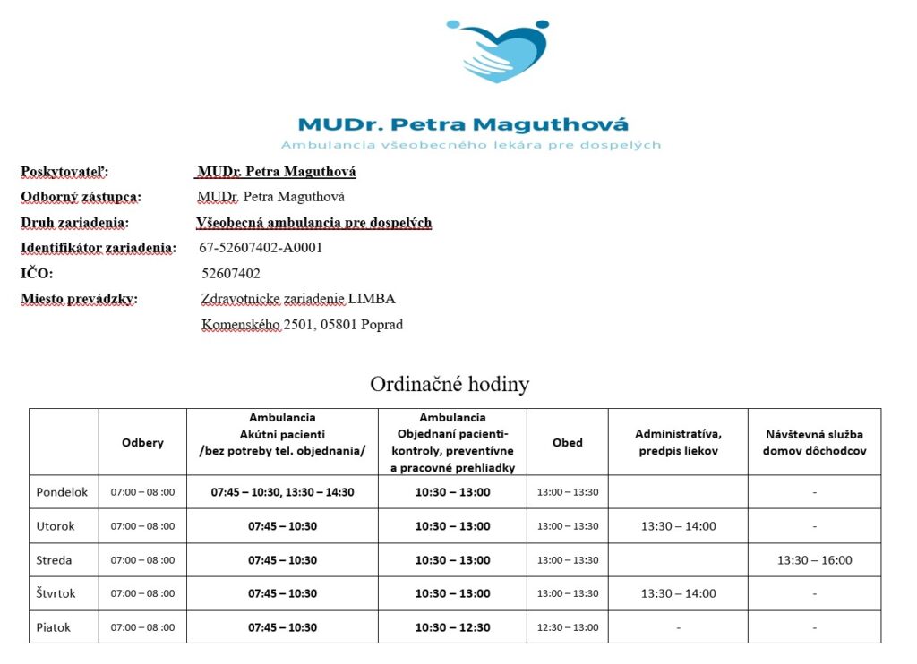 Zmena ordinačných hodín od 12.01.2026! Prosíme o ich dodržiavanie. Akútni pacienti bez potreby telefonického objednania každý deń do 10:30 hod. Po 10:30 hod objednaní pacienti, kontroly, preventívne a pracovné prehliadky .Čas po 13:30 si vyhradzujeme na administratívnu činnosť /predpis kúpeľnej liečby, zdravotníckych pomôcok, elektronických receptov atď..../ ďakujeme za pochopenie